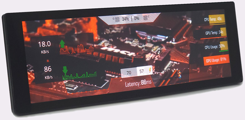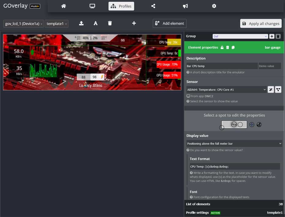 We provide you with the tools to do from shapes drawing (rectangles, circles, lines, etc) to the use of images as "sprites" to generate a rich envoirement in your display, as well of sensors to use with OpenHardwareMonitor, which is integrated in our app, so out of the box, you can have temperature, usage, fans, disks and audio information.